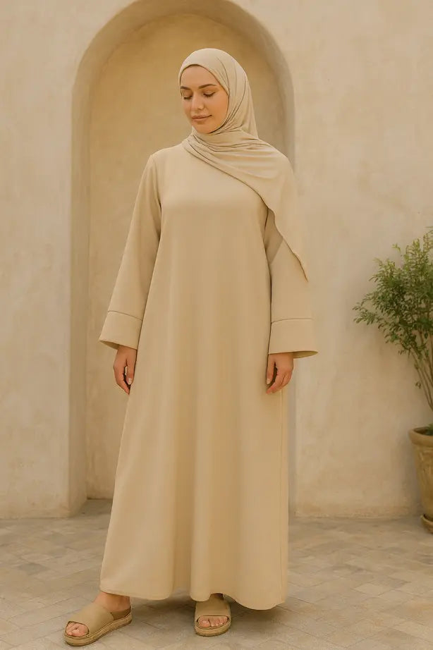 Look Décontracté Chic : Abaya Beige + Hijab en coton + Baskets premium + Sac cabas